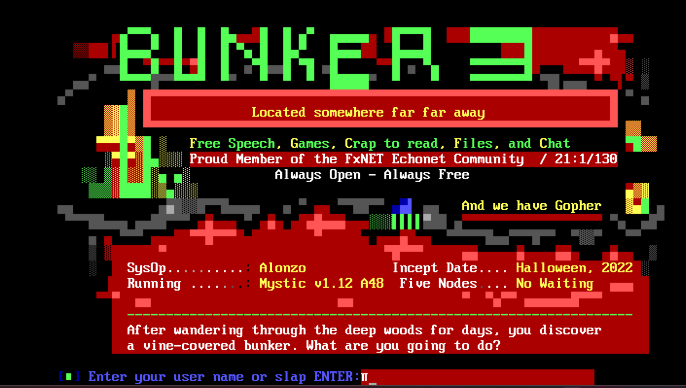 Bunker 3 is a Telnet BBS which means it uses the Telnet protocol (not HTTP